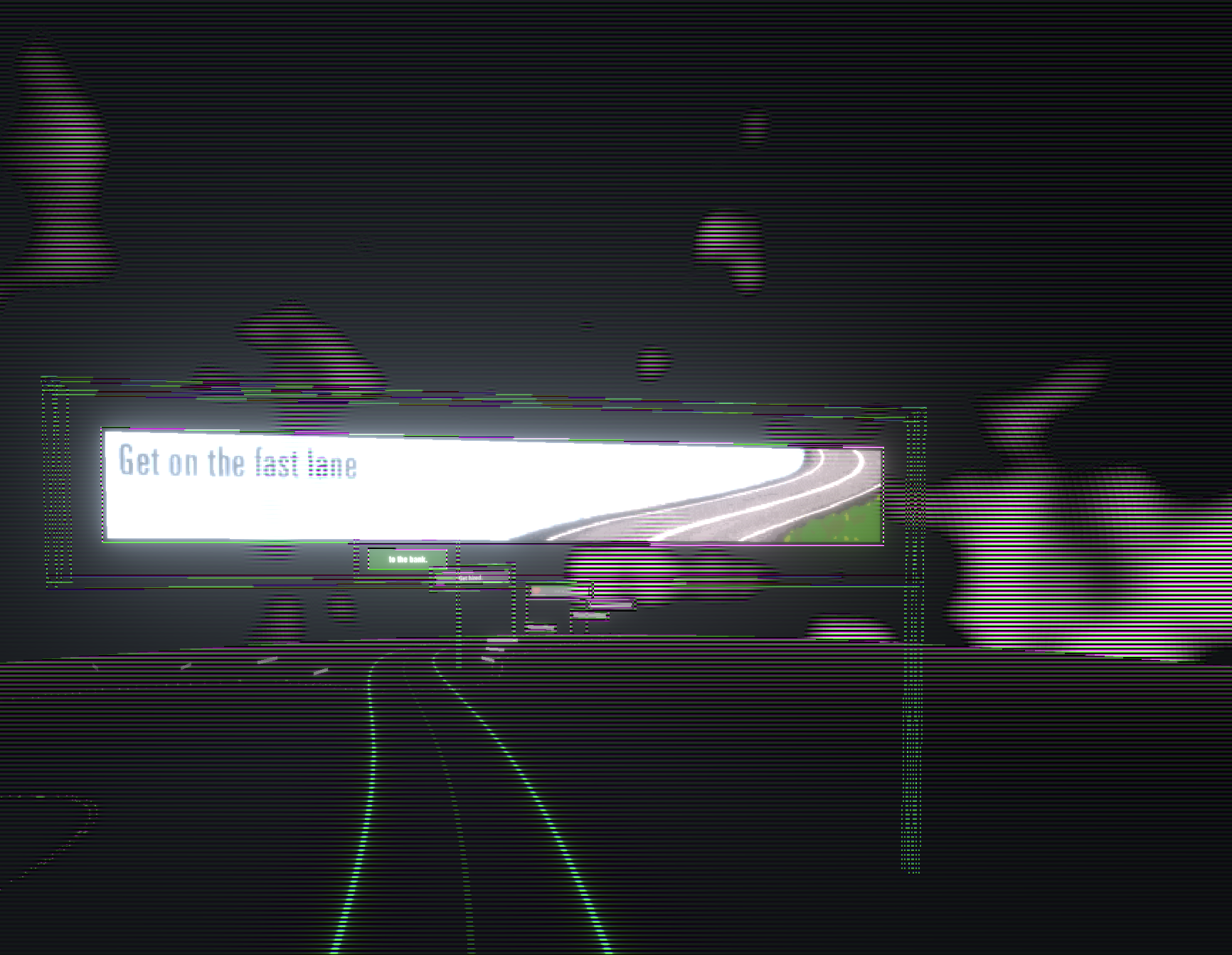 Drive down a virtual highway lined with billboards featuring static frames of 1990s-early 2000s web banner ads. As each billboard comes into view, fragments of early web advertising texts appear in sequence, forming messages that resemble mid-century roadside commercial verse.