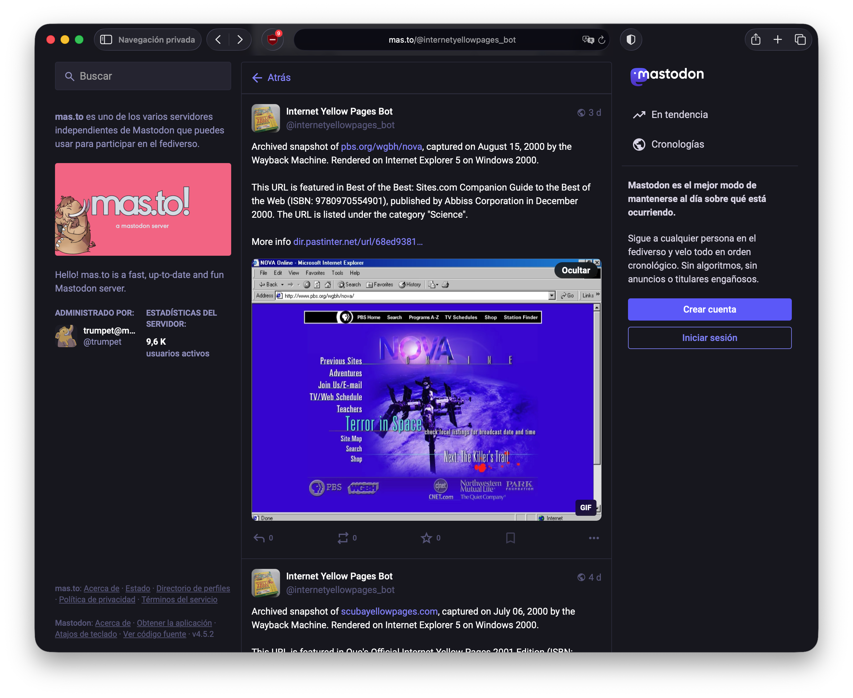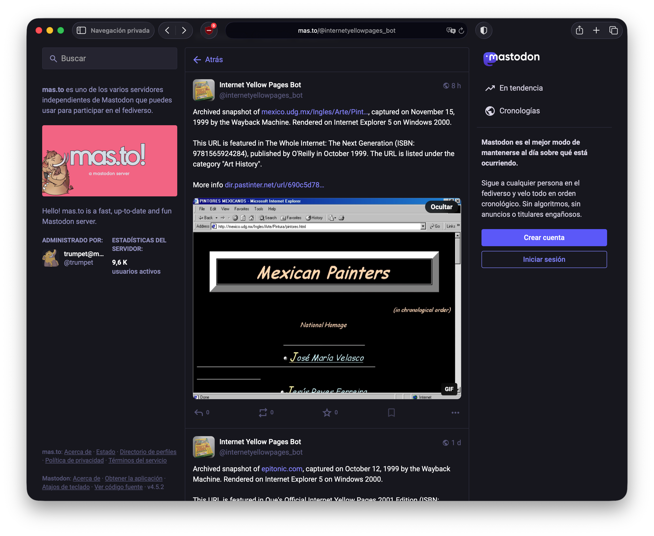 Internet Yellow Pages bot is a Mastodon bot that posts videos of historical web pages featured in printed Internet directory books published 1990s-early 2000s being loaded in period-appropriate browsers.