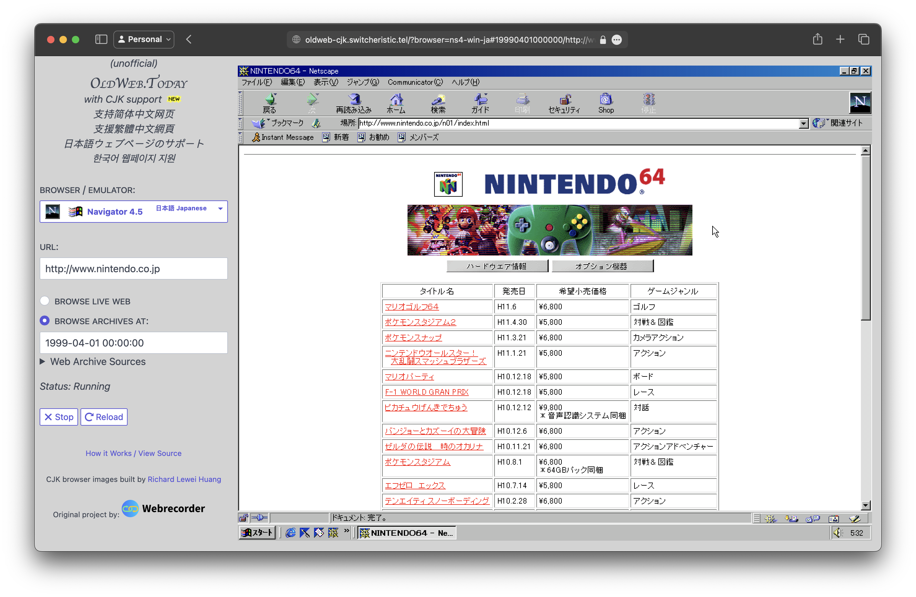 oldweb-cjk is a fork of the oldweb.today project. Browsers offered on the original oldweb.today project do not support viewing CJK web pages. oldweb-cjk remedies the problem by offering CJK-capable browsers for emulation.